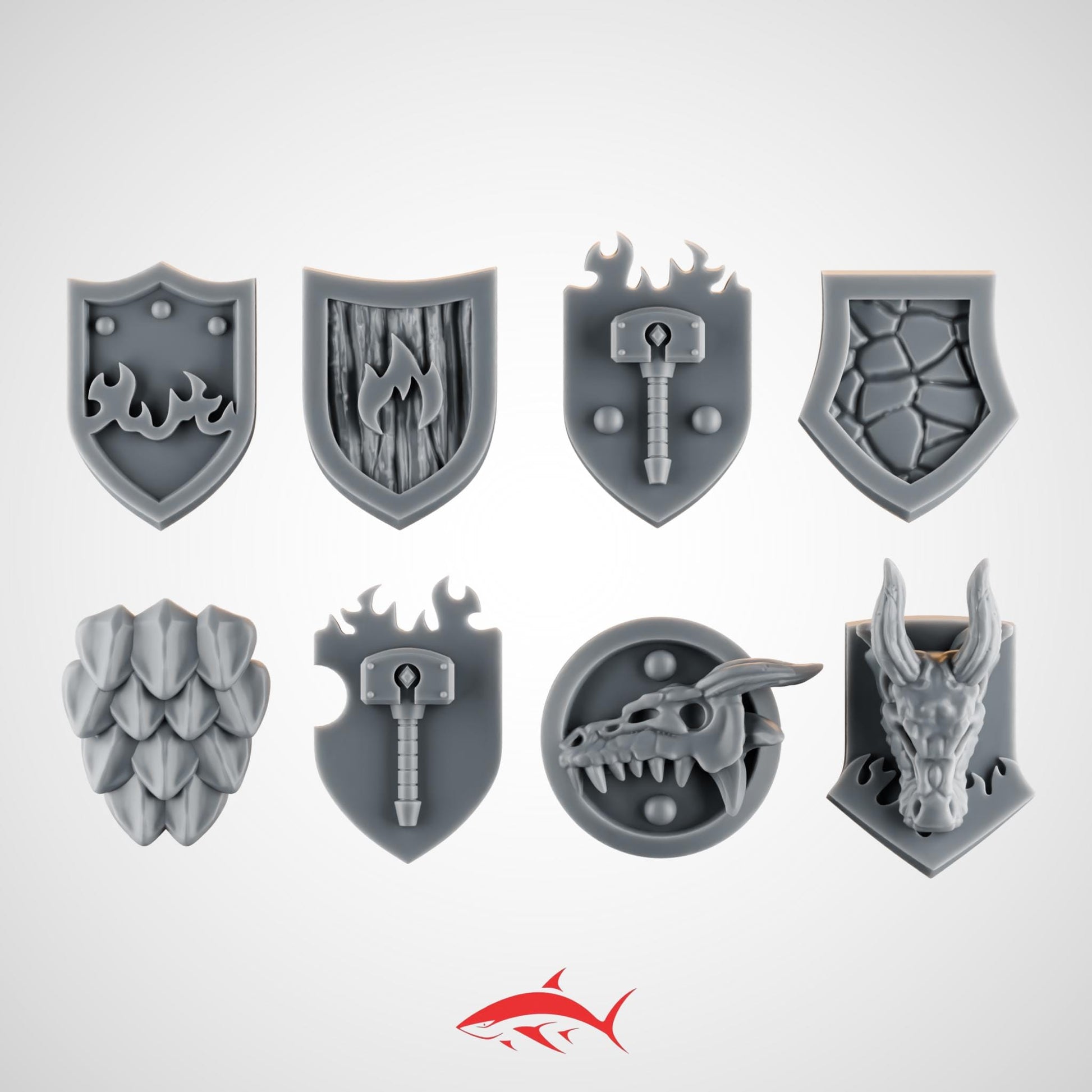 8 Shield Pads – Ember Forge Heraldry for Fire Lizard – Flames, Hammer Seals, Scales & Dragon Heads