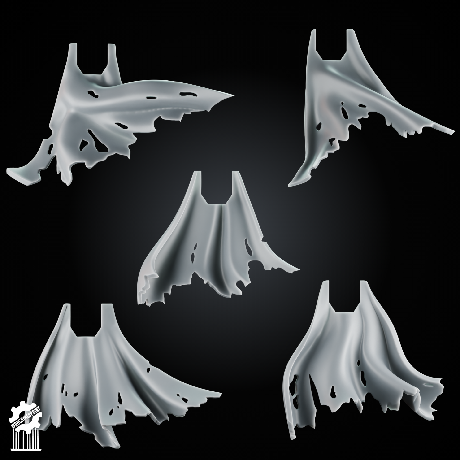 Bring gritty realism to your army with this set of 5 damaged cloaks, sculpted with torn fabric, wear marks, and battle scars for a weathered, veteran look.