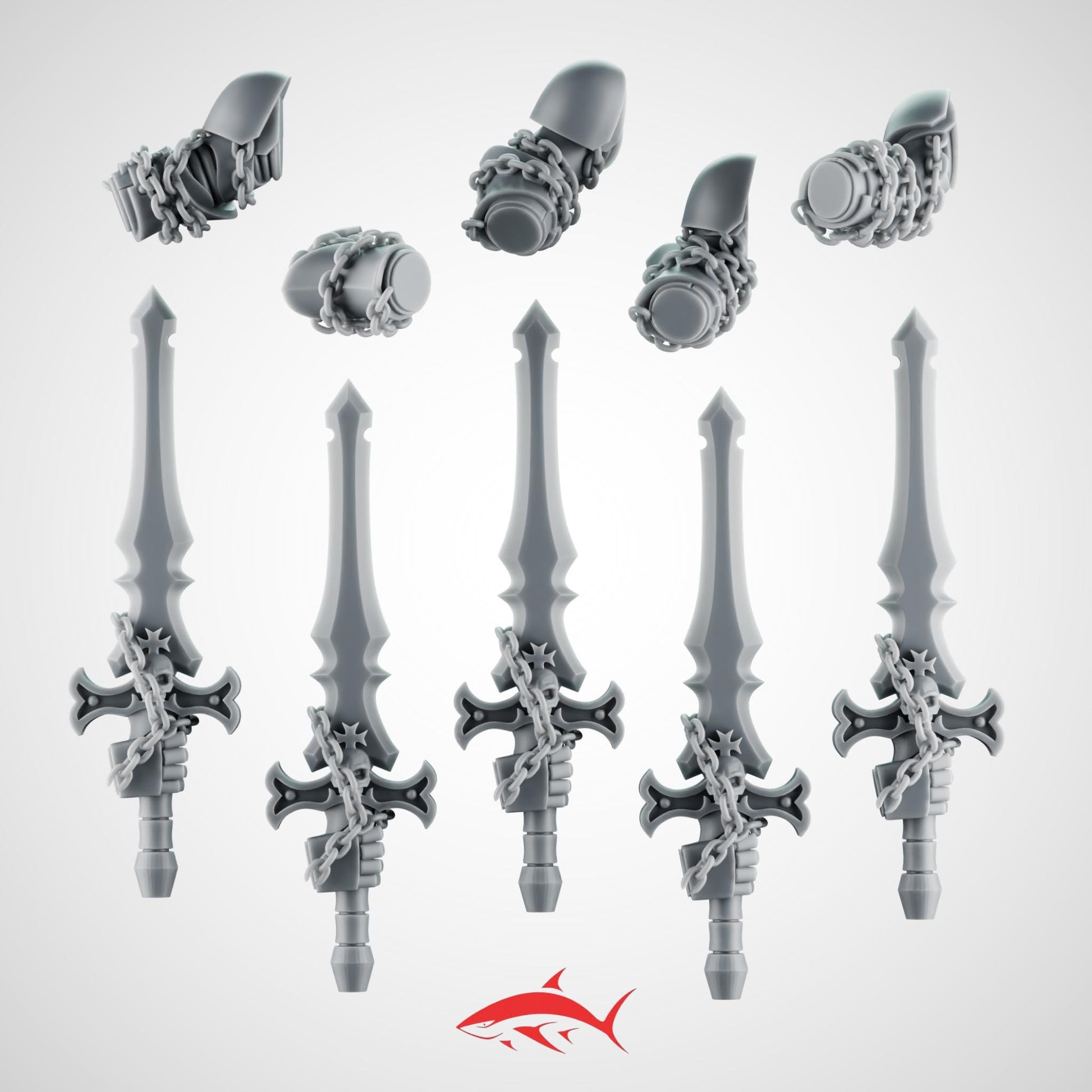 Set 1 - 5 Black Crusader Chain Swords – Knightly Power Blades with Chains to Arm – Ultra HD 14K