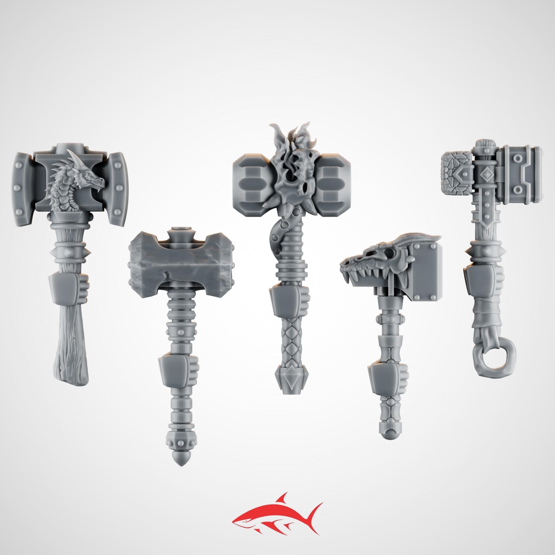 Set 1 – 5 Emberforge Hammers for Fire Lizard – Dragon-Head Mauls, Rune-Carved Blocks & Forge Emblems
