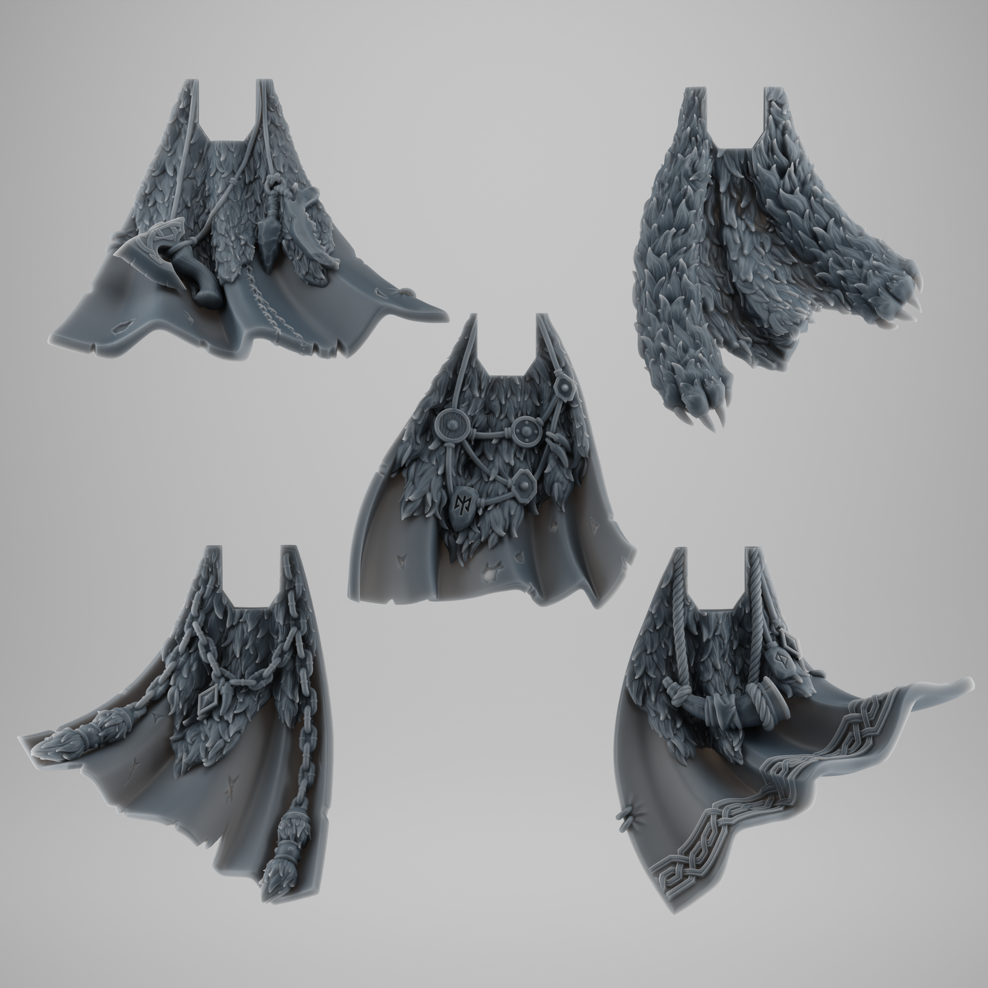 SET 1 - 5 Viking Wolf Cloaks – Fur-Covered Capes with Tribal Details – 32mm Kitbash Bits