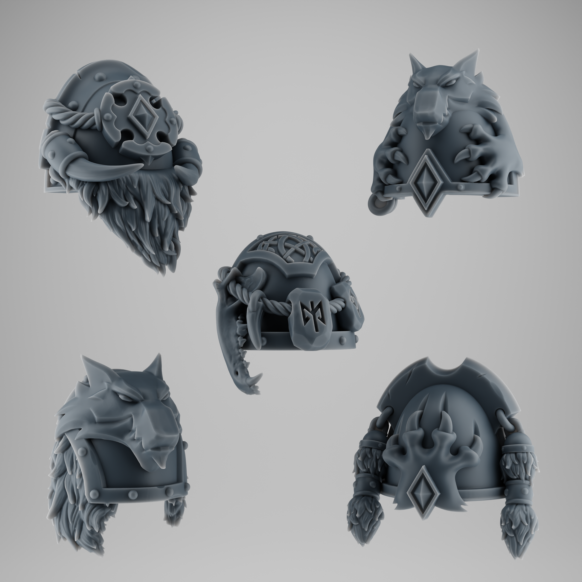 SET 1 - 5 Viking Wolf Shoulder Pads – Fur-Covered Kitbash Bits – Grimdark Accessories – 32mm