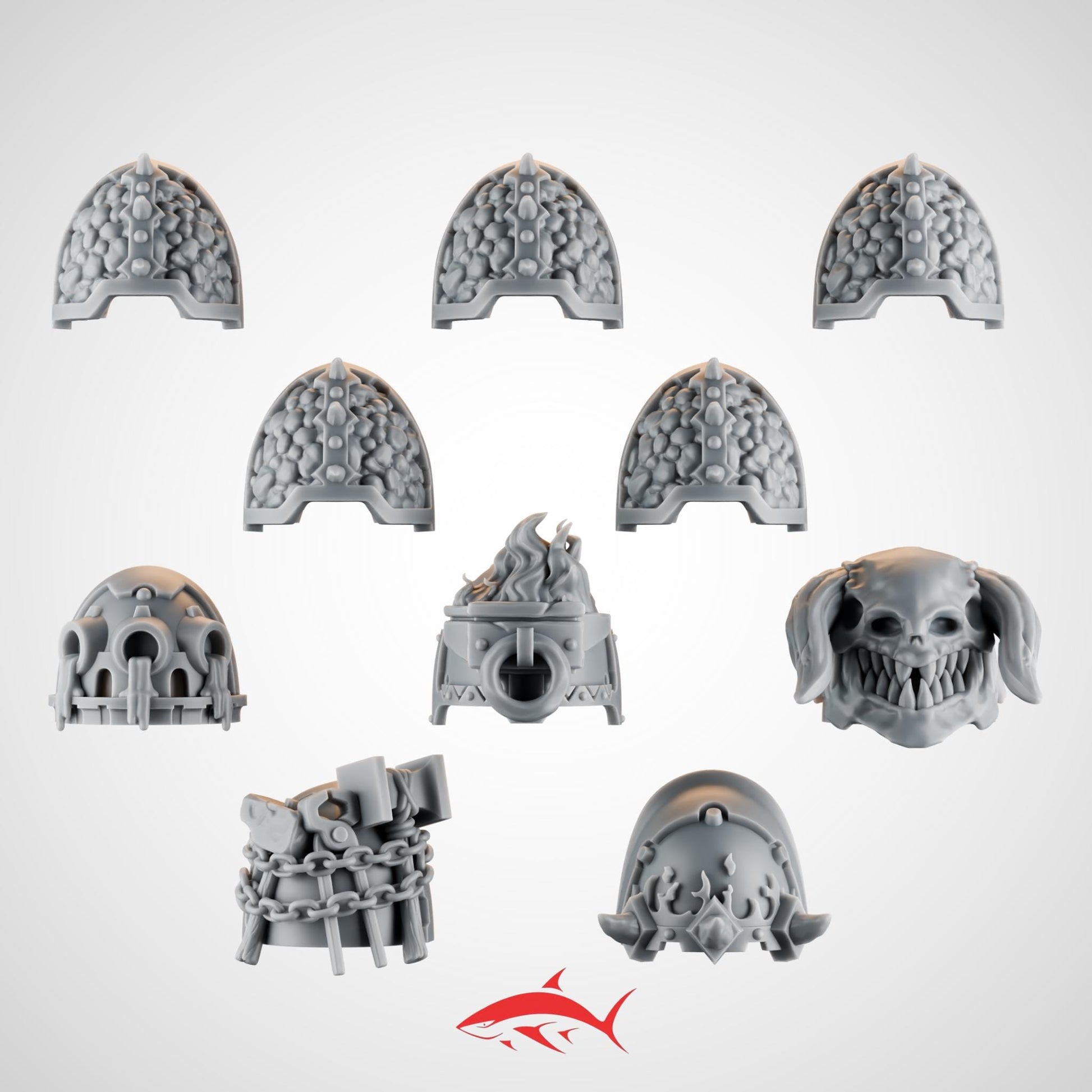 Set 2 – 10 Ember Forge Shoulder Pads for Fire Lizard – Flames, Chains, Spikes, Relics & Stone Motifs