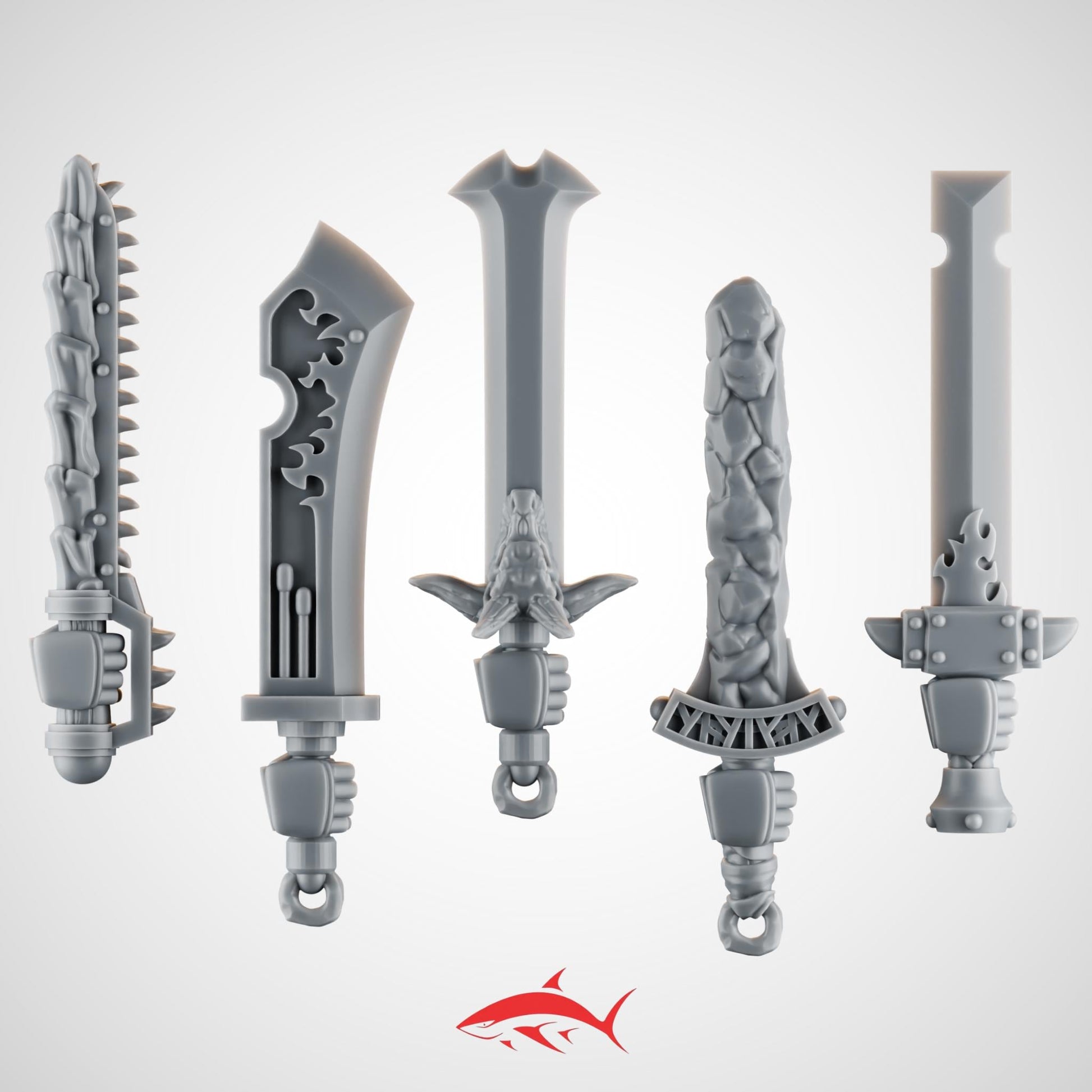 Set 2 – 5 Ember Forge Swords for Fire Lizard – Dragon Motifs, Flame Runes, Scaled Hilts & Chain-Blade Variant