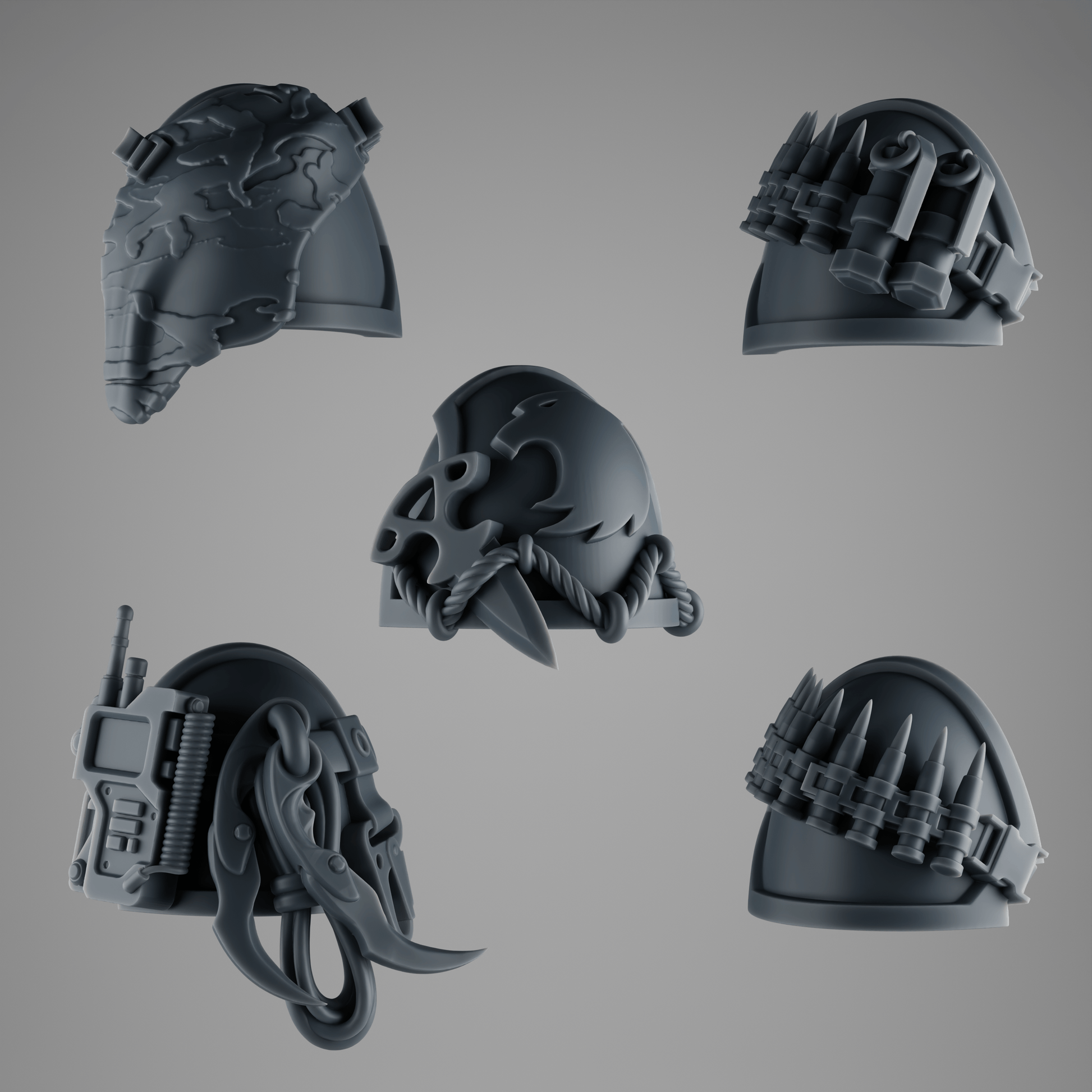 Ideal for kitbashing jump troops, recon elites, or special ops fighters, these shoulder pads embody the brutal practicality of warriors who strike fast and disappear.