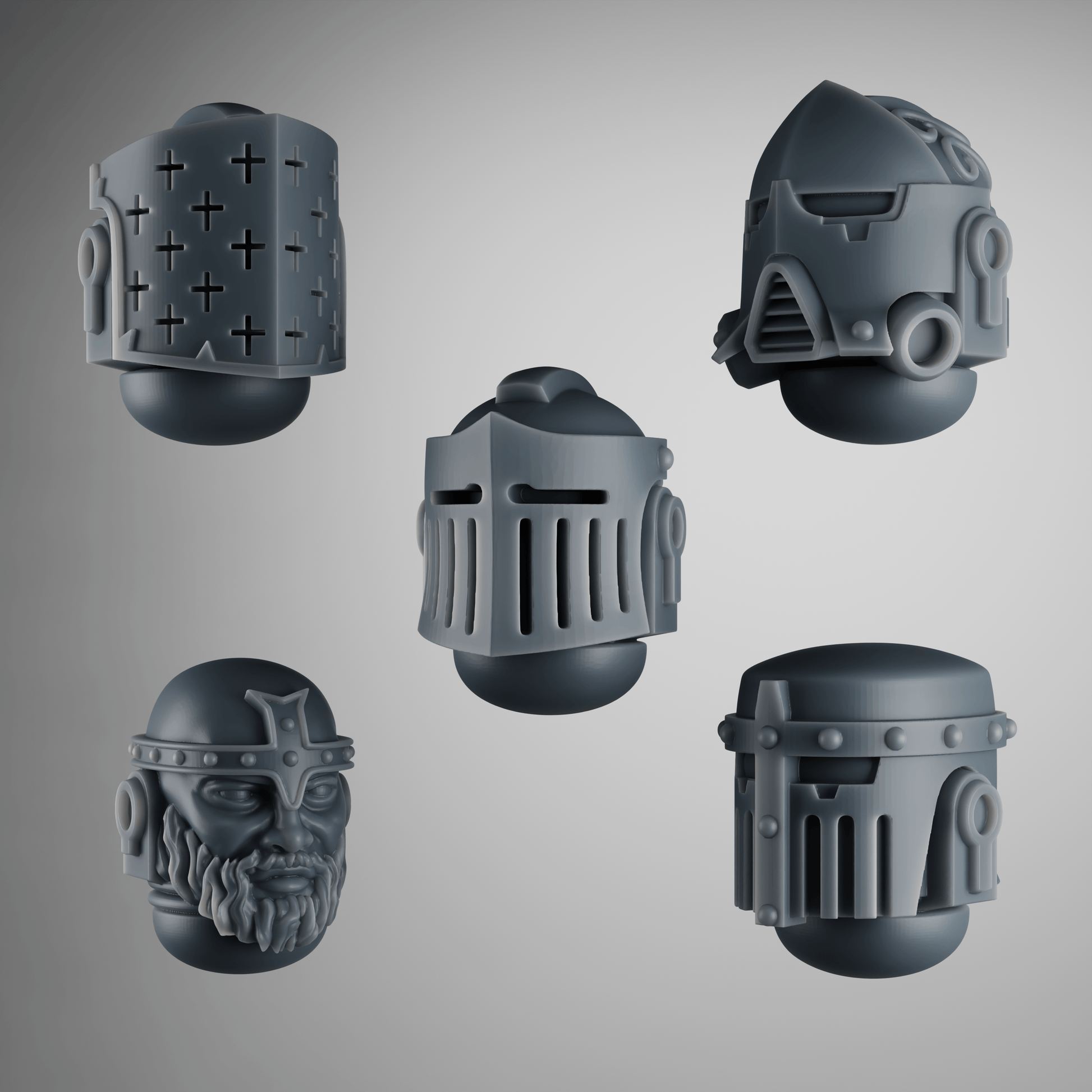 SET 3 - 5 Crusader Helmets – Gothic Heads for Black Faith Warriors – 32mm Kitbash Bits