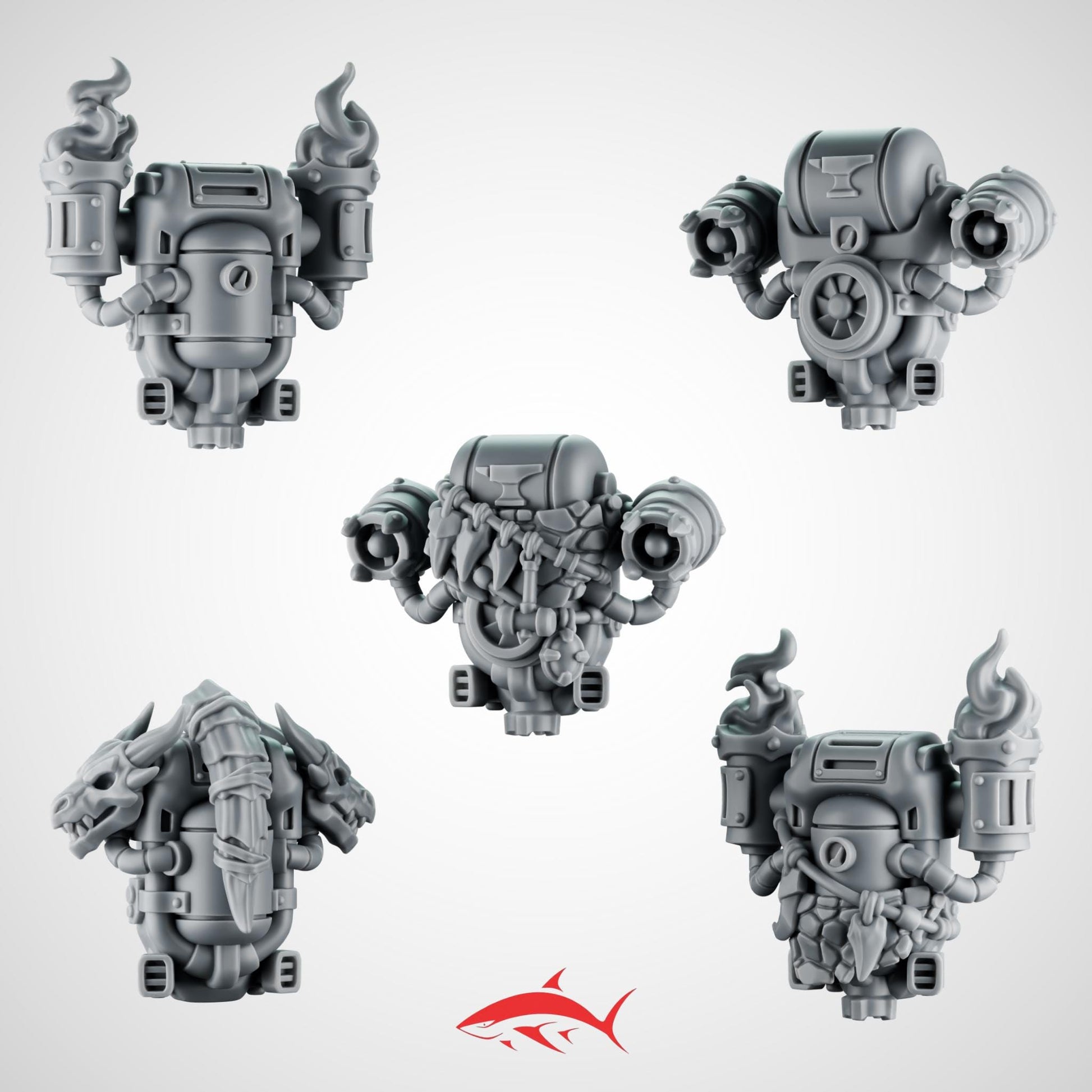 Set 3 – 5 Greytide Backpacks for Fire Lizard – Dragon-Skull Reactor Packs with Chains, Vents & Totemic Trophies