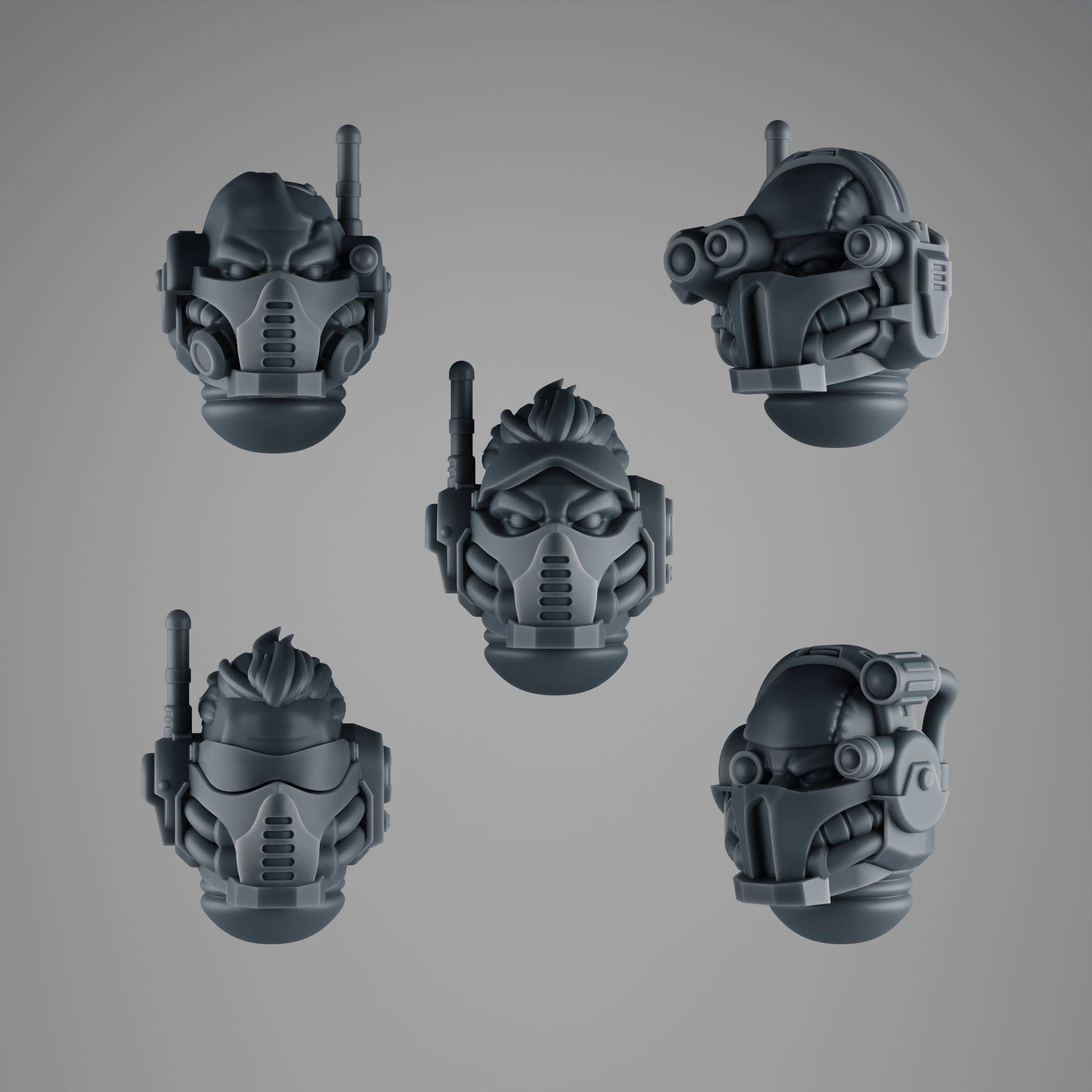 Outfit your fast-striking Rapt’ops with these 5 tactical heads, designed for jungle warfare and silent infiltration. Each head features integrated goggles or visors, rugged facial protection like bandanas or wraps, and high-tech details such as antennae, reinforced plating, or communication gear — ideal for recon-themed jump troops and special ops warriors in grimdark sci-fi settings.