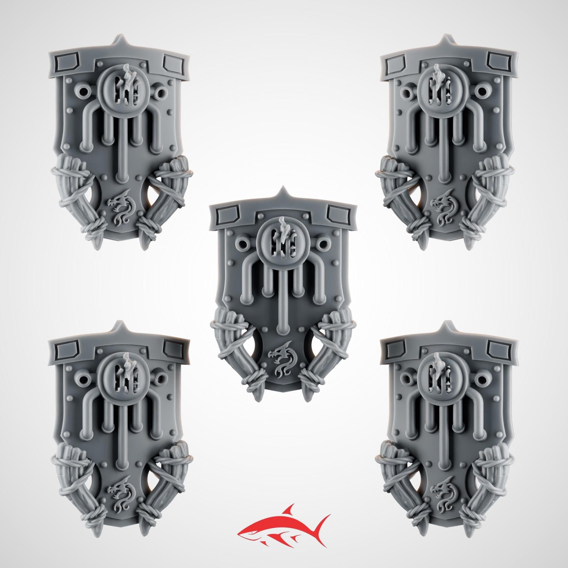 Set 3 – 5 Terminator Shields – Ember Forge for Fire Lizard – Candle Sigils, Pipework, Rope Lashings & Riveted Frames