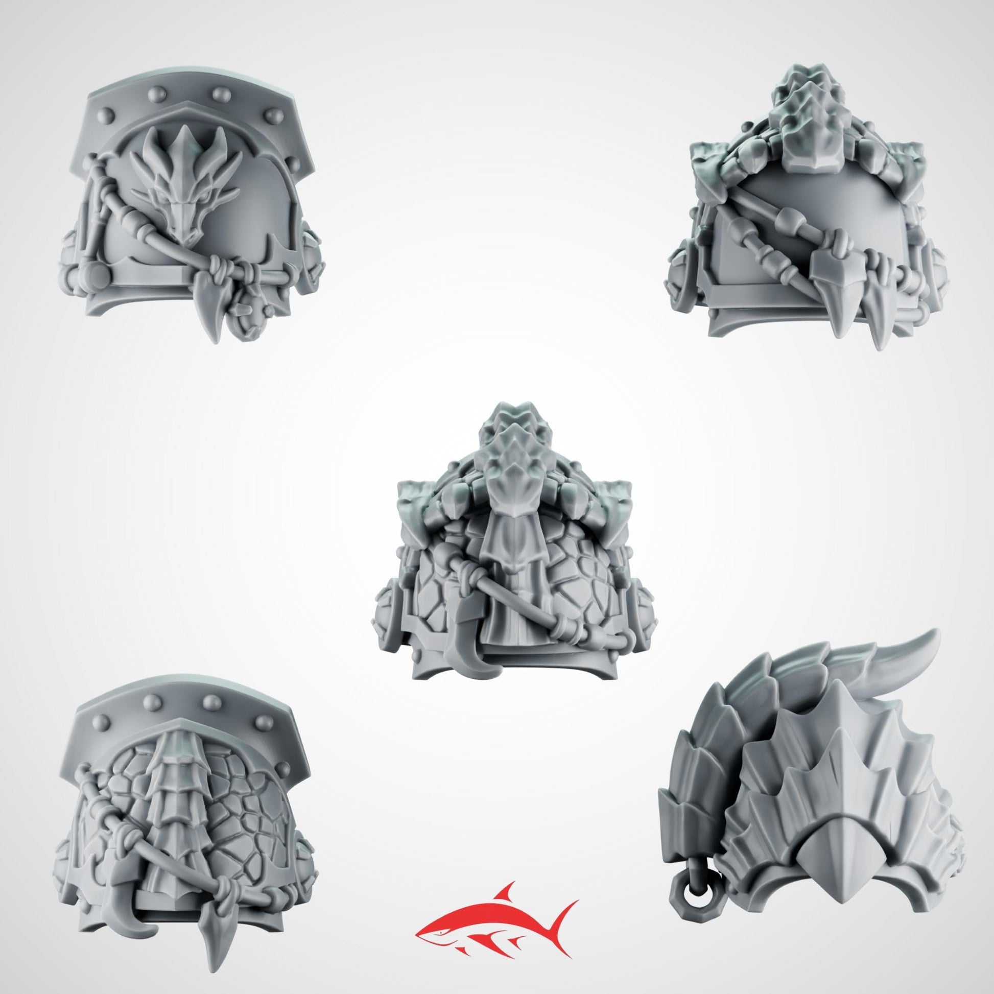 Set 6 – 5 Greytide Shoulder Pads for Fire Lizard – Flames, Chains, Spikes, Relics & Dragon Motifs