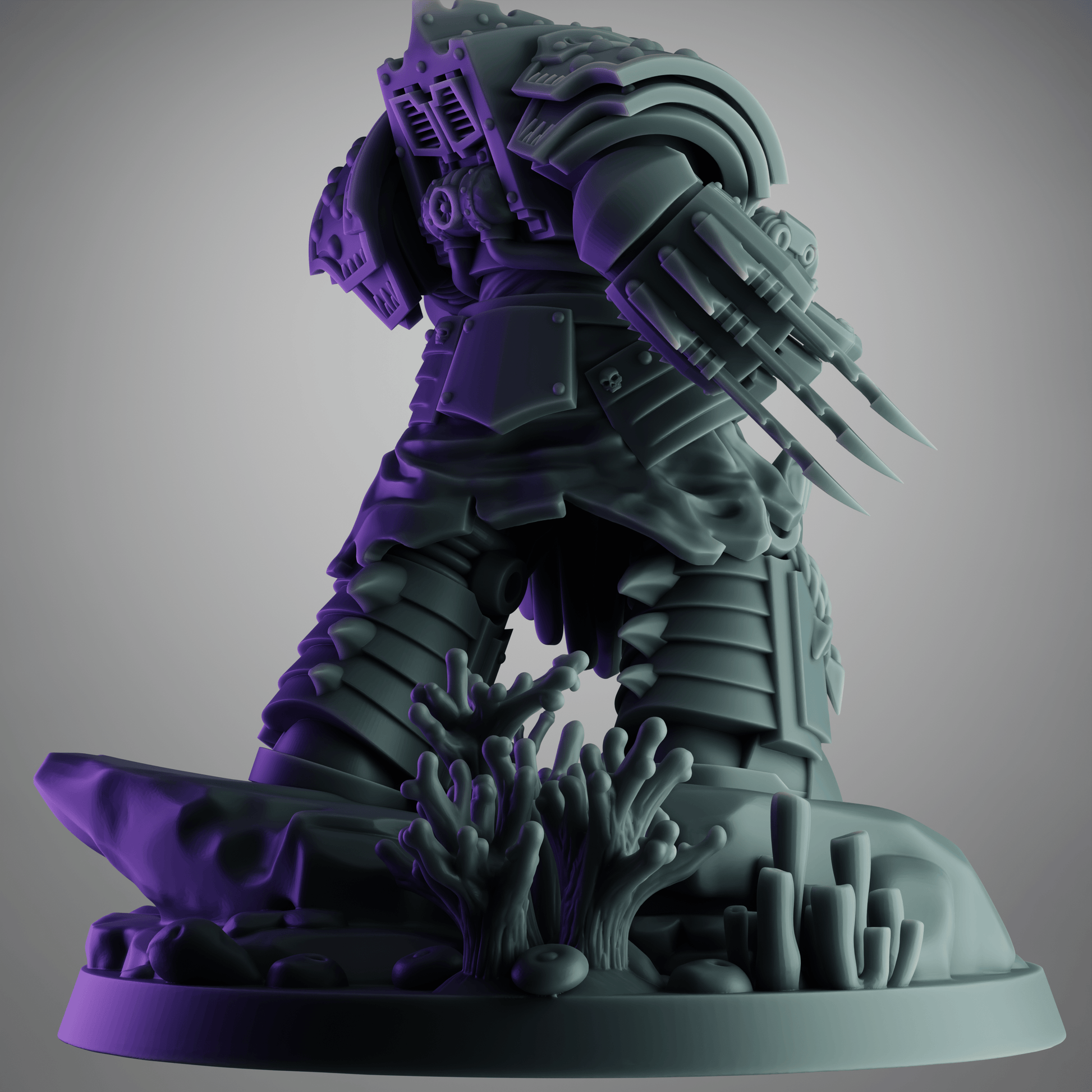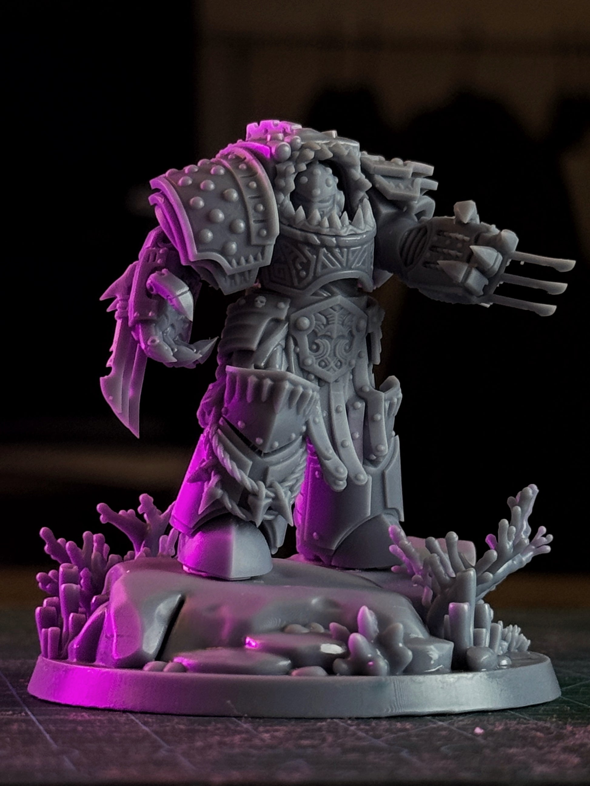 Lead your voidborn warriors with brutal grace. This fierce commander features shark-inspired armor, engraved runic details, and a grim visage worthy of a legend from the deep stars. Ideal as a centerpiece for a gothic kitbash or a dark crusade force prowling the silent void.